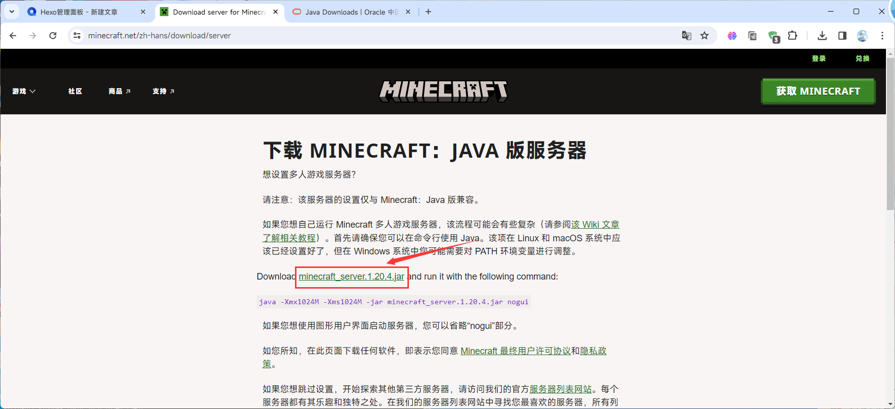 如果你打不开Minecraft官网,可点击minecraft_server.1.20.4.jar下载1.20.4版本的Server端。