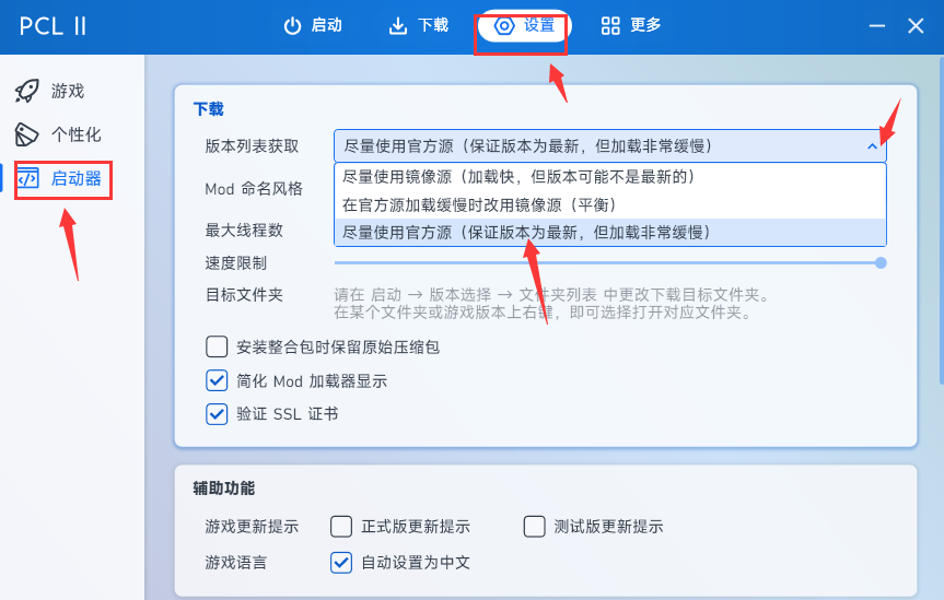 您可在PCL 2中的设置——个性化——下载——版本列表中选择尽量使用官方源。